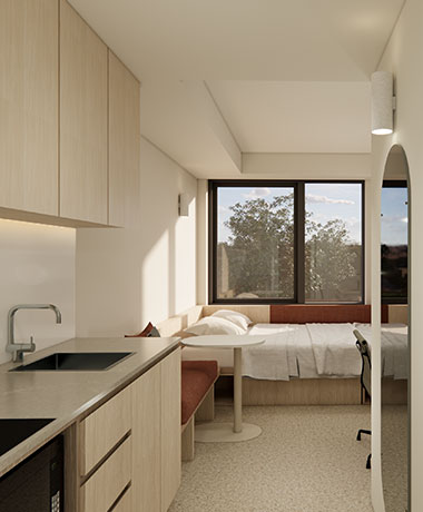 학생들은 2인용 쉐어 아파트 또는 개인 스튜디오 (원룸형태) 중에서 선택할 수 있습니다. 모든 입주 학생들은 헬스장, 스터디 공간, 야외 테라스를 포함한 건물내의 모든 공용 시설을 이용할 수 있습니다.
